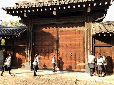 途中、武道センター・武徳殿前に、厳かな門を発見! 素通りしてしまいそうですが、これは実は価値ある大門!それは、幕末の京都守護職屋敷門が移築されたものです。今の京都府庁内にあったもので、激動の時代、その中心にあったものが今も移築されて残っているのは奇跡的です! 1862年に守護職についた会津藩の松平容保も、新選組も、この門を通ったことでしょう。間近で見るメンバー達。やはり立派です!