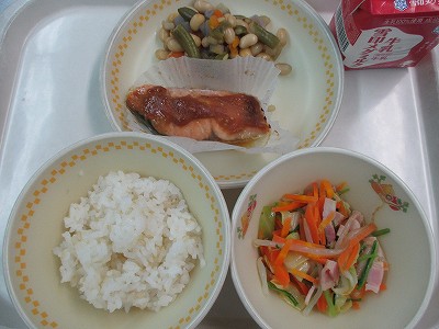 キャベツのソテーは人参、もやし、壬生菜を合わせています。どの野菜もシャキシャキとした食感がおいしい野菜です。壬生菜は水菜とともに、年中出回っている野菜ですが、旬の季節は冬です。葉先がしゃもじのように丸くなっているのが特徴で、食感が水菜に似ていますが、水菜よりも少し柔らかさがあります。和え物にすると少し辛みを感じる野菜です。