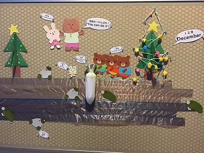 In the hallway there are many Christmas books on display that the students can look at and practice their English reading skills.