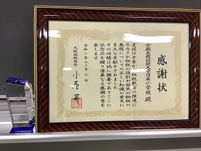 大阪国税局より、本校が租税教育推進校として、感謝状と記念品を授与されました。