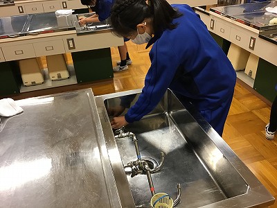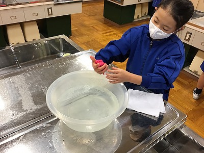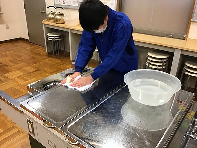 今日のECO生活クラブは、前回作った「マイECO掃除グッズ」を使って、家庭科室の掃除をしました。洗剤や水を無駄に使わない、エコな活動を目指しました。バケツにはったお湯に、毛糸のたわしをつけてしっかりぬらします。