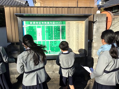 古地図では、本校周辺のお寺が江戸時代末期の古地図の位置とほぼ変わっていません。今回、仁王門通りを西に歩きながら、それを確認しました。