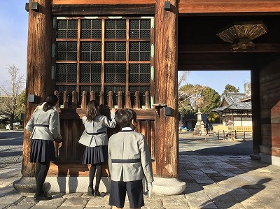 二天門の名の通り、この中に持国天と多聞天(毘沙門天)がおられます。運慶・快慶作と伝えられていると聞き、「へぇ~」「はぁ~」とうなずく6年生。「鎌倉時代前の作品が場所を変えながら、今も大切に残っていたということかなぁ」と、いろいろと想像を巡らすメンバー達でした。