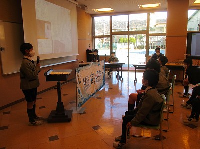 海プロから帰った次の週から、「活動報告新聞」を作り始めました。その新聞をもとに、4年生5年生の11名が、体験したことや海洋高校の生徒さん達と調査したことを、思い思いの言葉で発表してくれました。