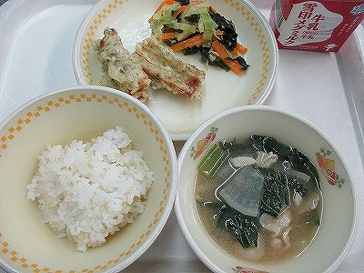 酢の物はキャベツ、人参、わかめを合わせました。ツナやゴマが入って香ばしい風味があります。野菜だけで酢の物を作るよりも食べやすくなりました。わかめはミネラルや食物繊維が豊富でビタミンK、ヨードなどの重要な栄養素が含まれています。わかめは漢字で「若布」になります。昔は若返りの薬とされ、縁起物・神様へのお供え物にされていたそうです。