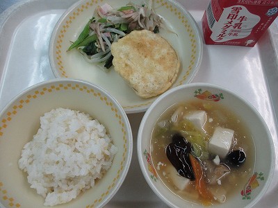 小松菜、まいたけ、もやし、ベーコンの炒め物です。小松菜は、骨や歯の材料になる「カルシウム」が豊富な野菜です。貧血予防に効果のある鉄も含まれています。特にカルシウムは、小松菜と形の似たほうれん草よりも多く含まれています。炒め時間が少なく済むように、下茹でをしてから調理しました。