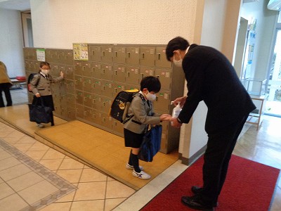 下校時です。校長先生が子ども達に声をかけます。「元気でね~。」