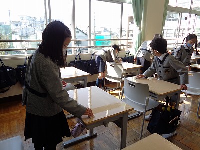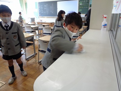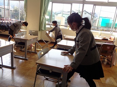一年間使ってきた愛着ある机を、次に教室に入る新学年を想って、しっかり拭いています。