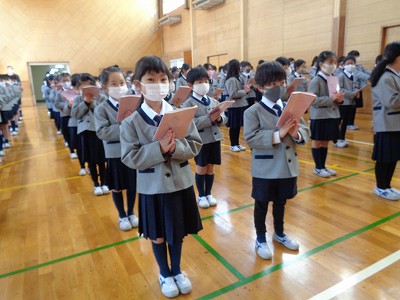 子ども達一人ひとりは通知票を受け取る時、担任の先生よりお話と激励を頂きました。きっと来年度に向けて、前に進んでいこうと新たな希望を持てたことでしょう。