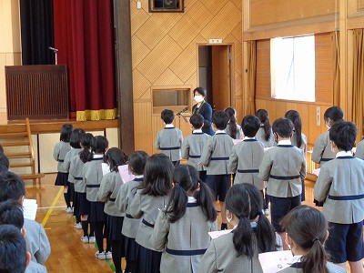 終わりに、明日から始まる春休みで、事故のないように過ごすこと。また、早寝・早起き・朝ご飯で体調を整えること、毎日元気で過ごしてくださいとのお話でした。