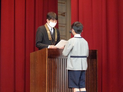 5年生代表が「修了証」を受け取りました。一年間、学校生活での全ての学びによく努力し、その全てを学び終えた証です。
