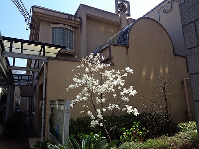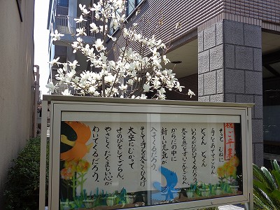 小学校校舎前のモクレン。