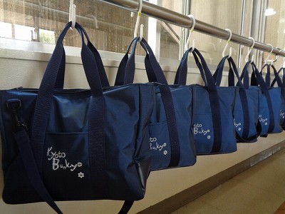 今日から午後まで学習が続く学校生活がスタートしました。朝の廊下を見ると、文教バッグがきれいに並べられていました。