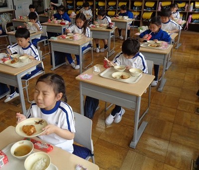 給食は、給食当番さんの初仕事!パントリーまで取りに行き、おかずの配膳も担当しました。