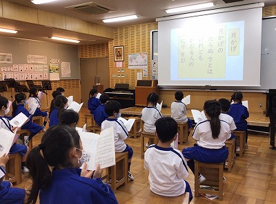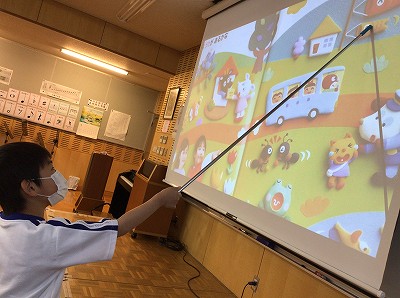 こちらは、「うたのかくれんぼ」を学習しているところです。教科書のp2,3「どんなうたがあるかな」のページには、たくさんの歌がかくれています。