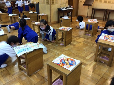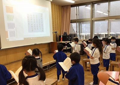 お経に節が付いている歌なので、同じ音程が続きます。子どもたちは、日頃から歌い慣れている感じと違っていても、歌声を届けようと取り組んでいました。