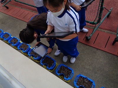 そして、最後に、各自がタブレットで自分の植木鉢の写真を撮って終わりました。あさがおの成長が楽しみです。