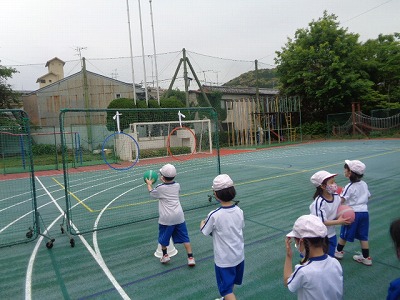 続いて「投げる力をつけよう」というめあてで、ボールを投げてコーンを倒したり、輪っかをめがけて投げる練習をしました。