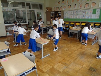 ペアで協力して、机を運ぶのは一苦労ですが、机の列をそろえるのが、とても上手に