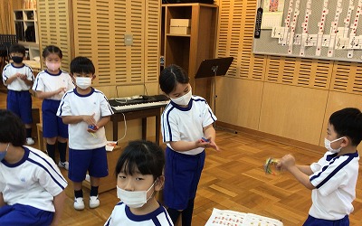 「♪ぶんぶんぶん」の歌唱練習をした後に、“リズム打ち”の学習をしました。