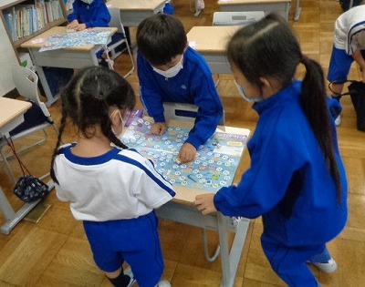 雨の半日となりました。中間休みには、算数セットからすごろくを取り出して、楽しんでいる姿がありました。雨の日の楽しみの一つになったことと思います。