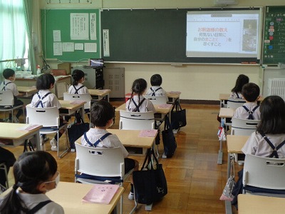 礼拝後は、お話をもとにクラス全体で1学期の前半、がんばれたことを振り返ったりしました。無言右側歩行や挨拶ががんばれたという声を届けてくれました。