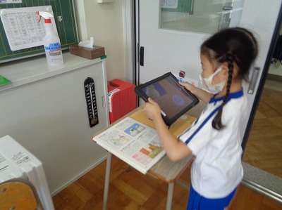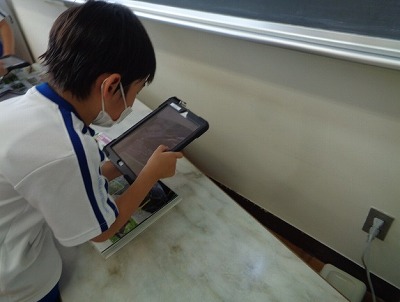前回まで「くちばし」の文章を音読したり、問いと答えを書き写したりしました。今日は、細長い形をしたハチドリのくちばしについて考えた後、自分でくちばしクイズを作るために、タブレットでくちばしの写真を撮りました。