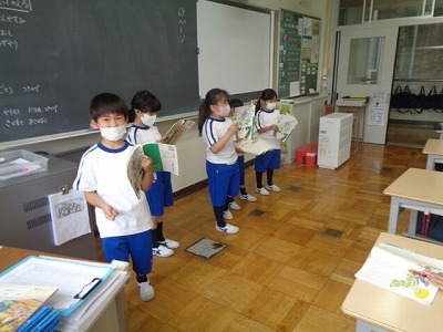 今日は、登場人物の役割を決めて、ナレーターと音読しました。
