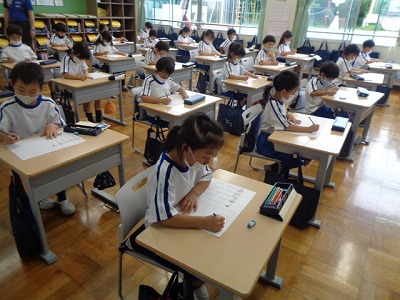 毎日取り組んでいる書き取りテストでは「きょうかしょ」など、小さい「や・ゆ・よ」を含んだ言葉や「かきごおり」「おねえさん」のような間違えやすい言葉を練習しました。