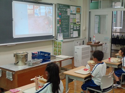 とても喜ぶ1年生。子ども達は、想像をかきたてる楽しい"うそ"たっぷりの面白い絵本を聞きながら、野菜たっぷり焼きそばを、よ~く味わって食べていました!