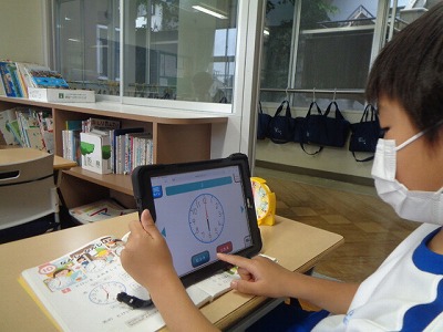 時計の学習です。まずは、算数セットの時計を使って、12時、1時、2時・・・と針を動かして、ちょうどの時刻を読む練習をしました。さらに、長い針が6を指すと30分と読むことを学習しました。