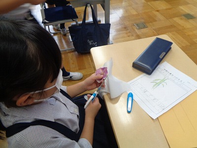 1学期に朝顔を押し花にしていました。今日は、仕上げです。まず、切り取りからスタート。