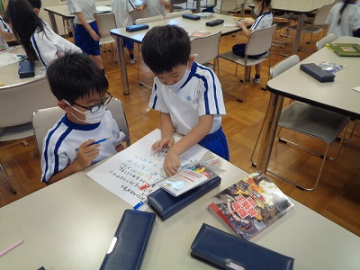 その後、係ポスターを作り始めました。終わらなかったので、4時間目の図書の時間に続きをしています。活動内容をメンバーで相談して、ポスターにまとめていきました。