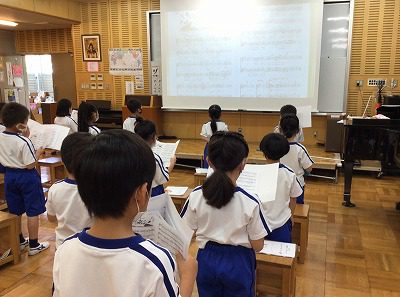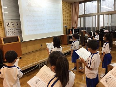 今日の仕上げは、1番、2番、エンディングまでを通して歌いました。お兄さんお姉さんっぽく感じるメロディや歌詞ですが、1年生のみんなも熱心に取り組んでいました。