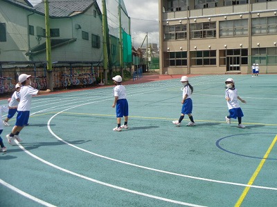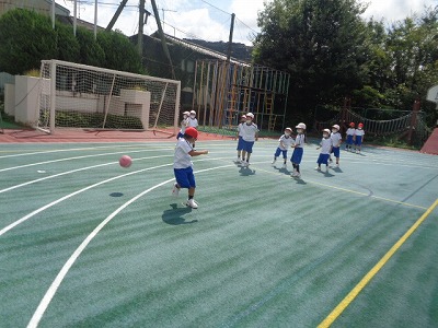運動場で、ドッジボールでいっぱい体を動かして遊びました。