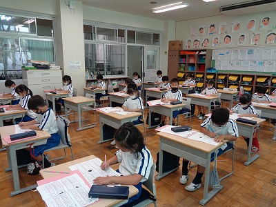 ところで写真は、アルファベットの書き取りの様子です。「T」まで進みました。丁寧に書けています!