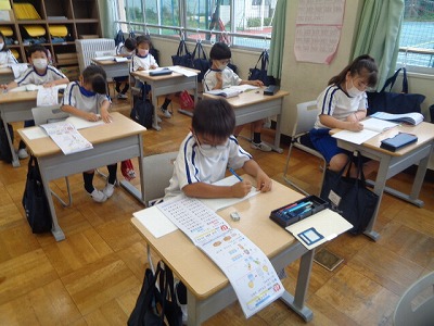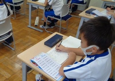 3つの数の計算のまとめです。教科書の復習問題に取り組み、計算ドリルも進めました。