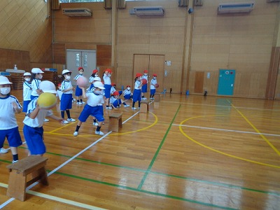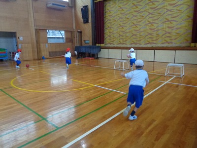 ボールをつきながら走る練習をはじめにしてみると、なかなか難しそうな様子・・・何回か練習をしてから、リレーの時になると次の人にはやくボールを渡したいとがんばってつなぎました。