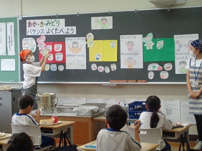 実習生さんのお話が今日で最後でした。赤・黄・緑のバランスのとれた食事が健康な生活のために大切であることや、三色のそれぞれの働きやどの食べ物が何の色かについて考えることができました。