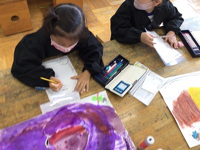 初めて<鑑賞プリント>を用いて、自分の作品について「がんばったこと」「見てほしいところ」「楽しかったこと」などを文字で表しました。