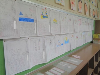 1年生の教室後ろの掲示板は、絵日記を掲示中です。