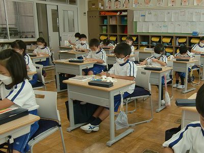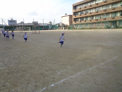 木曜日の朝、根っこマラソンでスタートです。準備体操の時間になったら、日直さんが体操をサッと始め、中・高校の運動場で久しぶりに走りました。