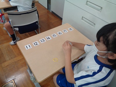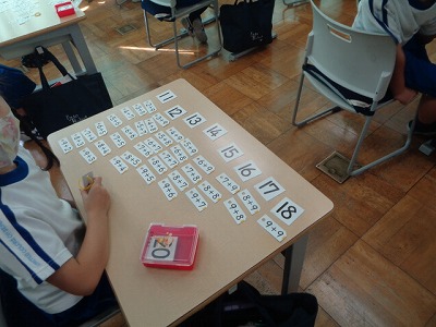 くり上がりのあるたしざんのカードを使って、答え別に仲間分けをしました。