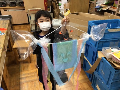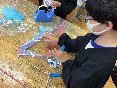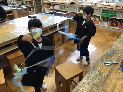 ひらひらとゆれる感じをこだわるのはもちろんのこと、色にこだわりを持ってつくる姿、おばけや動物に見立ててつくる姿、それぞれに工夫を凝らす姿がありました。
