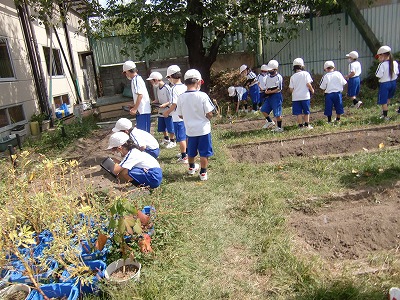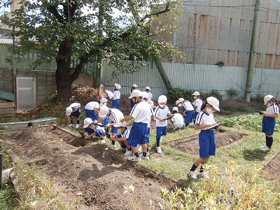ネイチャー委員会が今日のために、きれいな畝を作ってくれていました。立派な大根になるまで、水やりなどをがんばってお世話していきます。