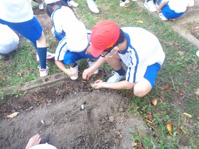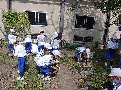 今朝は「根っこマラソン」でスタートしました。小学校の運動場をいつもより少なめに走り、学習園で待っていると、班長さんが来てくれました。班長さんと一緒に大根の「たね植え」をしました。