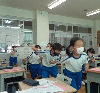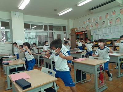 次に、空手の基本形を活用して、発音の抑揚・強弱を学習です。動きもバッチリ!