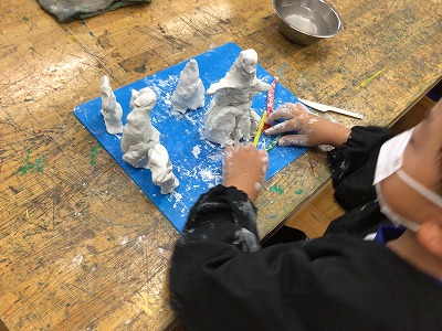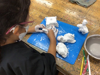 いつも使っている油粘土とは違う質感に戸惑いながらも、手もスモックも真っ白にして真剣に取り組んでいました。