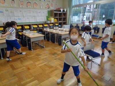 今日の掃除は、いつもお手伝いに来てくれている6年生が、集合写真撮影で少しゆっくりめの到着でした。それまでの時間は、1年生だけの掃除です。とても張り切って掃除をスタートし、ほうき担当さんが「一列目、どうぞ!」とはっきりと声かけをしていました。