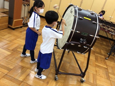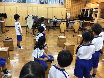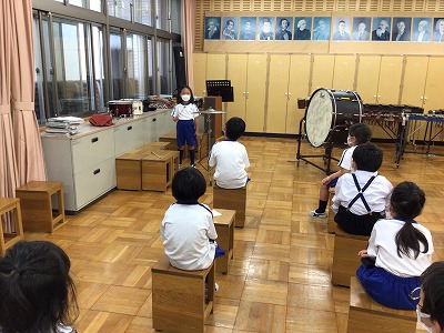 今日も、音楽室の打楽器紹介を行い、打ち方や打つ場所によって、音色が違うことを感じる学習に取り組みました。